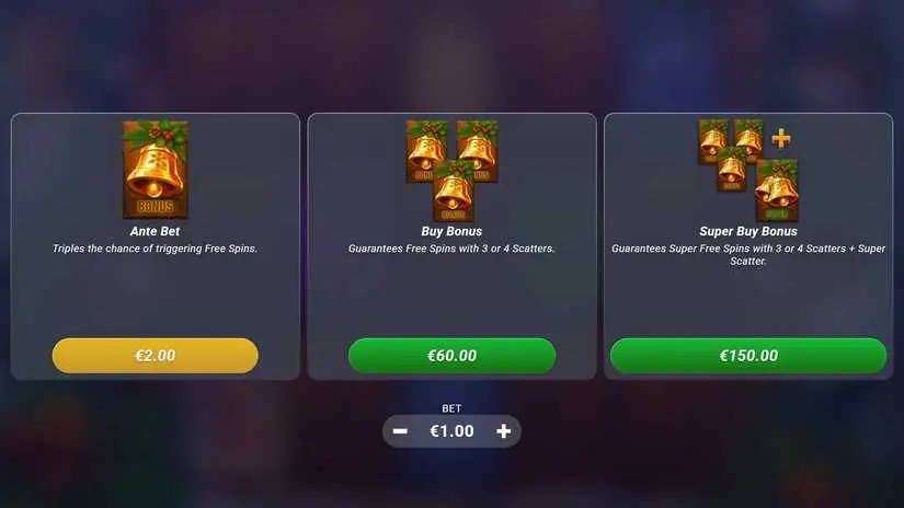 Buy free spins by placing a bet of 60x the standard bet to guarantee at least 3 Scatter symbols. Buy super free spins by placing a bet of 150x the standard bet to guarantee at least 3 Scatter symbols plus a Super Scatter.