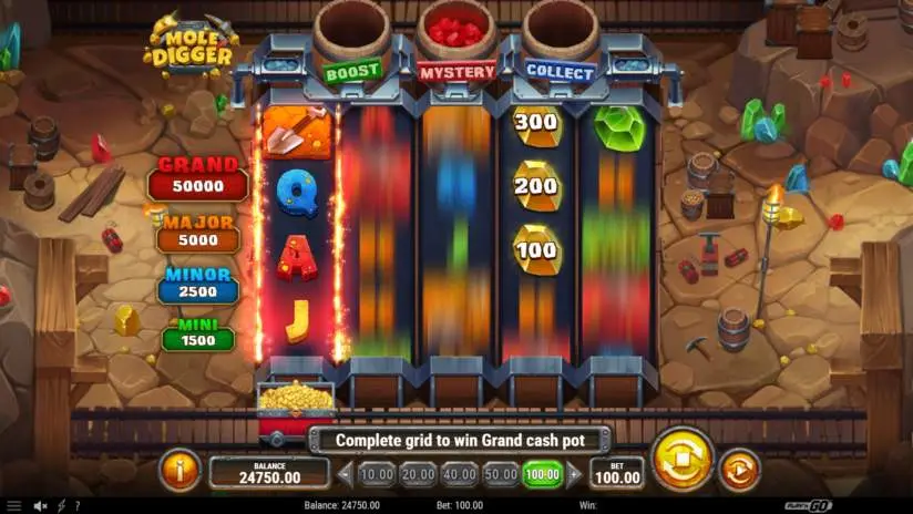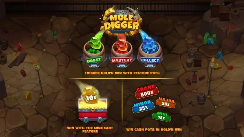 One or more mine carts can land below the reels on any spin. All cash values on the reel above any mine cart will be collected.