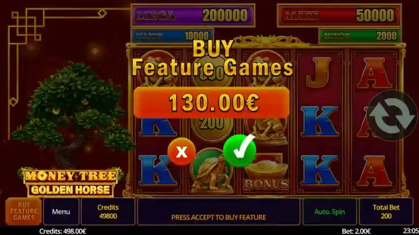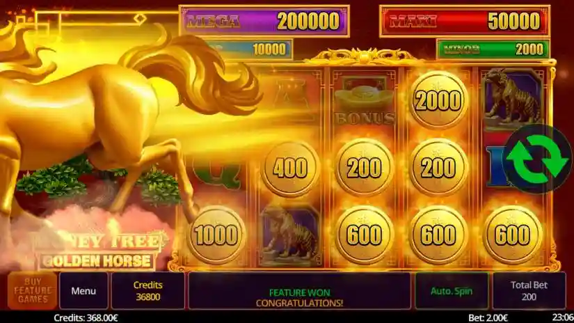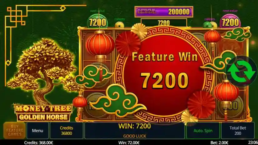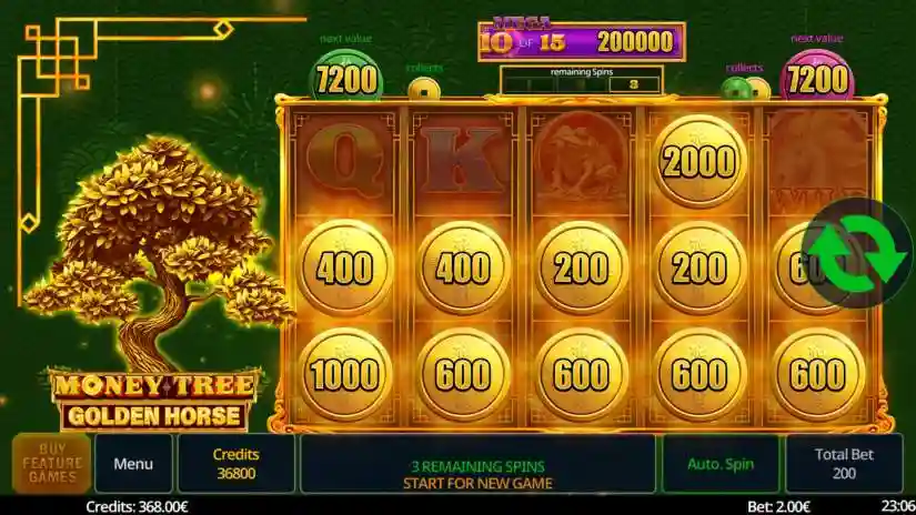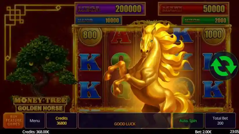 Money Tree Golden Horse is a 5-reel, 3-row slot from Swintt. The Wild symbol expands to cover the entire reel. The Wild symbol substitutes for all symbols except the Bonus and Coin symbols. The Pot Pick Feature is triggered randomly. 6 or more Coins trigger the Coin Feature. The Coin Feature can be purchased. 3 Bonus Symbols trigger the Mystery Bonus.