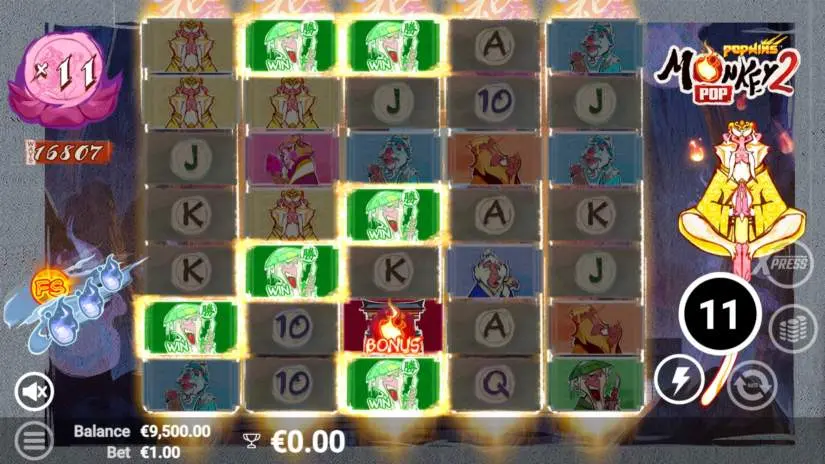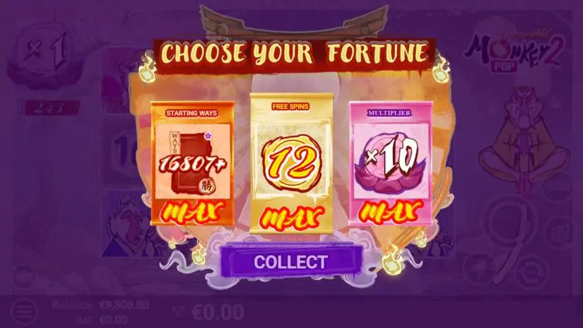 In the bonus game, the Monkey can randomly fill the Free Spins Collector and award +1FS or throw Wild symbols into random cells, allowing the game board to expand faster.