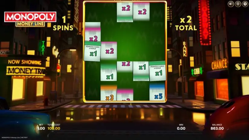 Street symbols, when appearing on the reels, have a multiplier equal to the value of one house. Green street symbols have a multiplier of x1, pink ones have a multiplier of x2, orange ones have a multiplier of x3, and blue ones have a multiplier of x5.