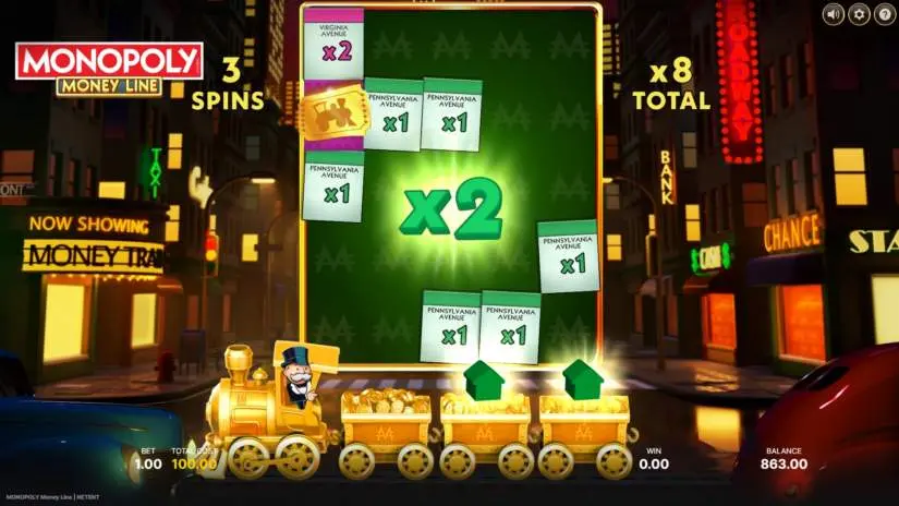 The Golden Ticket appears alone, with no other Streets or Collectors appearing during the same spin. At least one train is activated during each free spins session.
