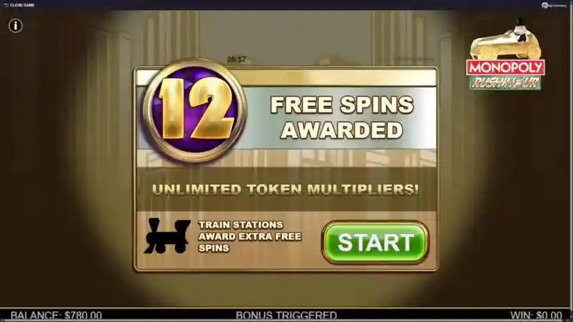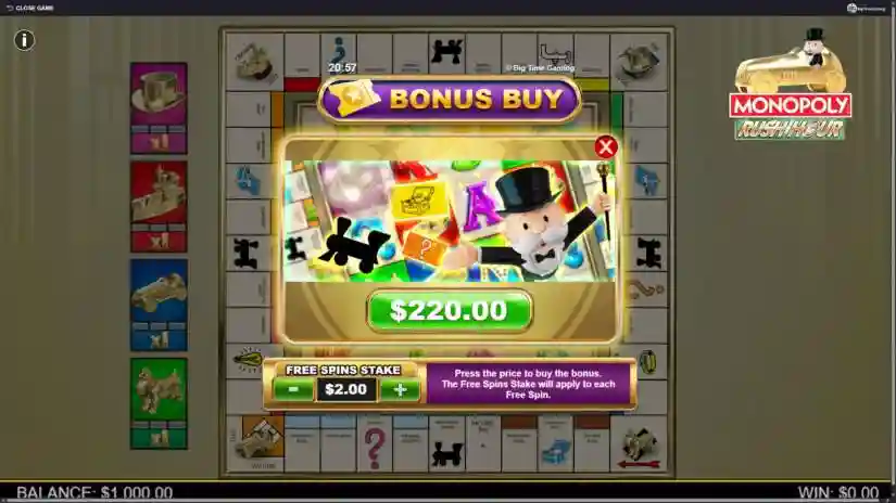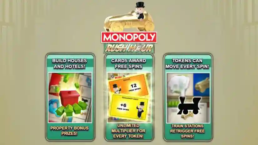 MONOPOLY Rush Hour — это игра от Big Time Gaming с 4 барабанами и 256 путями для выигрыша с бонусами на игровом поле MONOPOLY.