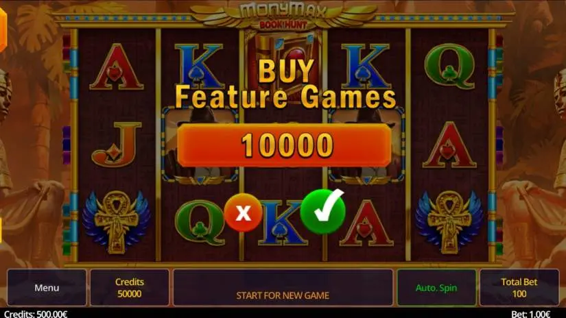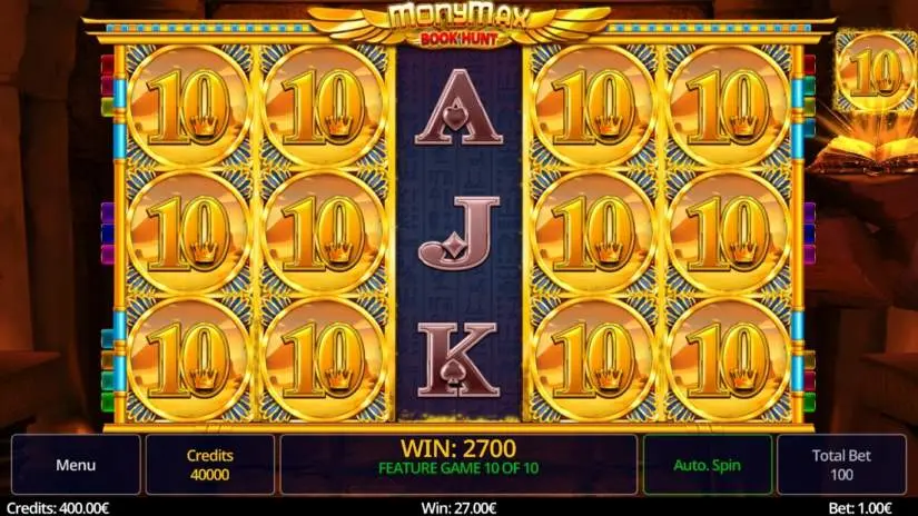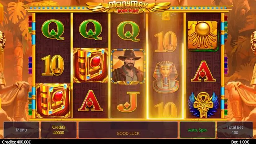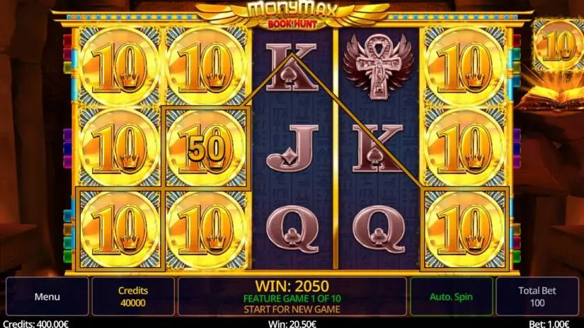 In MonyMax Book Hunt, 5 paylines are awarded from left to right on adjacent reels. Only the highest combination on a payline is paid. Wins on paylines are cumulative.