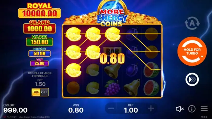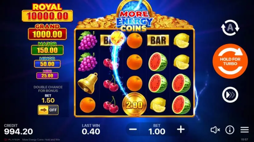 The Energy Bonus symbol, in combination with any Bonus symbol, activates the Collect feature in the More Energy Coins: Hold and Win slot from Playson. The Collect feature collects all Energy Bonus and Bonus symbol values, including payouts for Mini, Minor, Major, and Grand Jackpot symbols, and adds them to the win per spin in the Main Game or the Total Win in the Bonus Game.