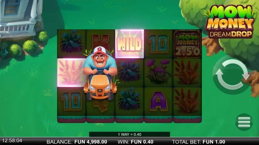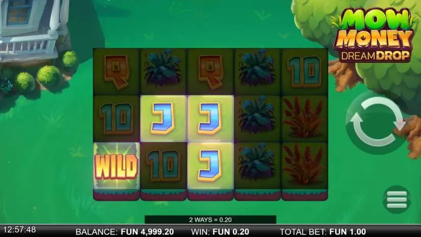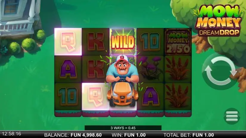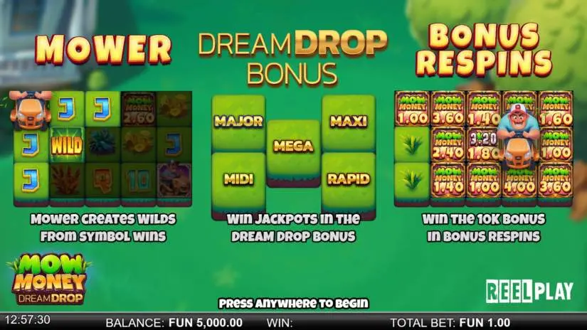 The player chooses the total bet size for the Mow Money Dream Drop game by ReelPlay from 243 options. Payouts are made according to the paytable. Multiplied by the total bet. All wins are multiplied by the total bet. Non-bonus prizes displayed above the SCATTER symbols are already multiplied by the total bet. The highest win is paid for a winning combination. Matching wins are added together. Only positions containing a winning symbol count towards the win for that symbol. All wins start from the leftmost reel and pay from left to right on adjacent reels. WILD substitutes for all symbols except SCATTER. WILD does not pay as a separate symbol. Each winning symbol (except SCATTER) explodes and is replaced by symbols appearing from the top of the reels and from the right on the top reel.