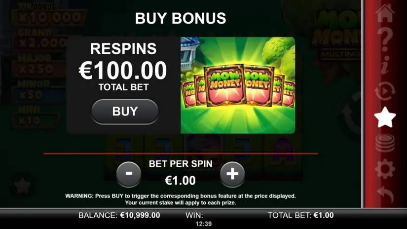 Players can purchase a re-spin bonus round in Mow Money MultiMax. The purchase price is 100x the bet per spin. The spin is activated by landing 6 Scatter symbols. Players receive 1 to 10 multiplier upgrades. Multiplier upgrades are automatically applied to the Multimax multipliers. Each upgrade increases the multiplier by 1 on a random reel.