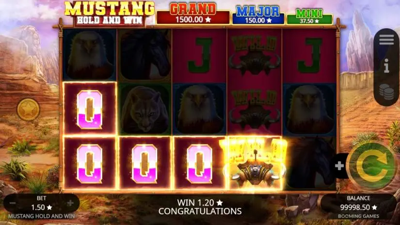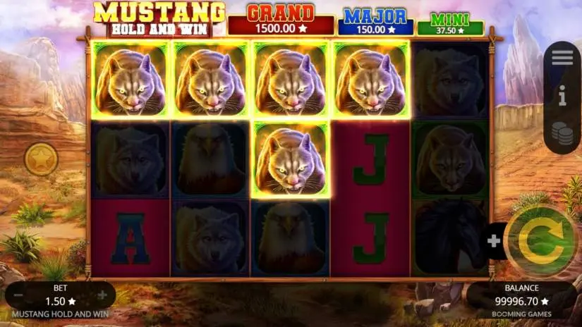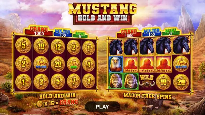 Mustang Hold and Win by Booming Games is a 5×3 slot game with 25 paylines, Hold and Win, Major Free Spins, Quick Hit Bonuses, and Stacked Wilds features. This game has a fixed number of paylines (25), and the number of active paylines cannot be changed.