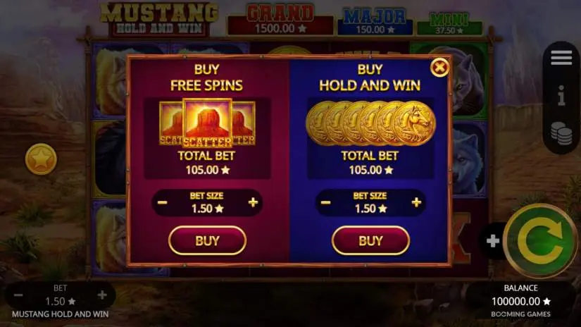 The Mustang Hold and Win game has a maximum win limit of 2,000 times the total bet. If the total win reaches or exceeds this limit, any active feature will end, and 2,000 times the main bet will be awarded.