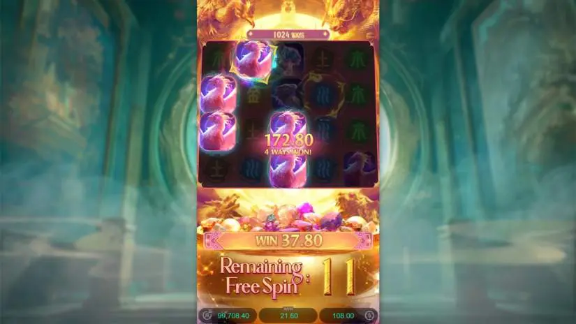 The maximum win in Mythical Guardians is 15,000 times the bet. If the total win in the main game or free spins reaches 15,000 times the bet, the spin ends.