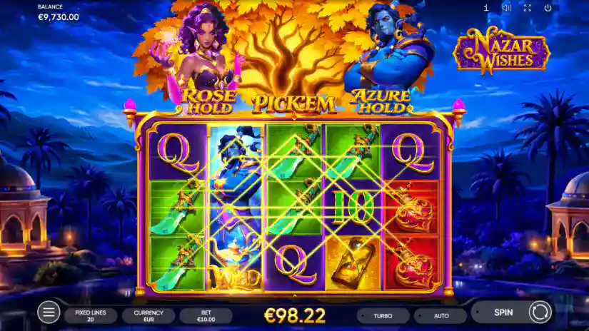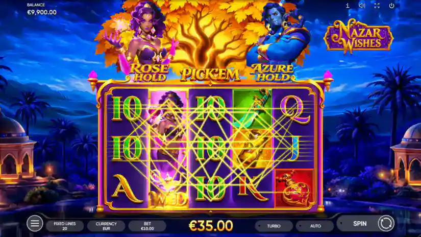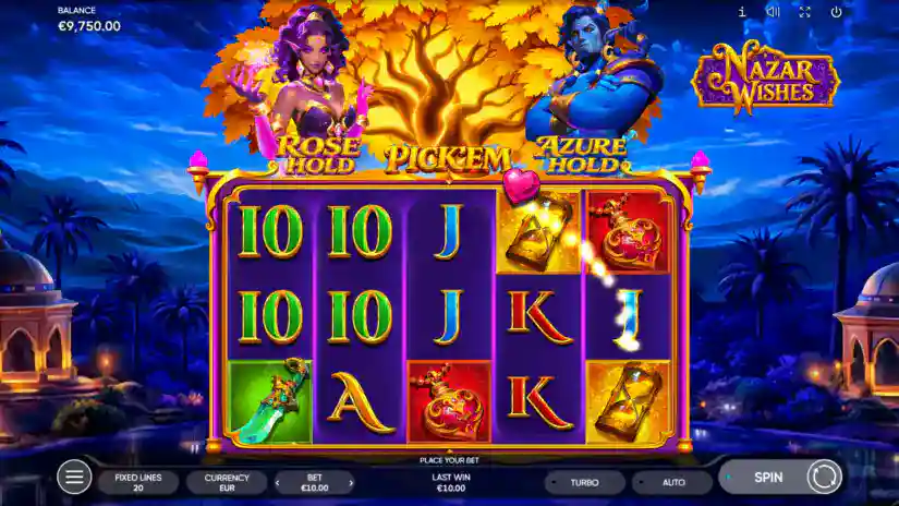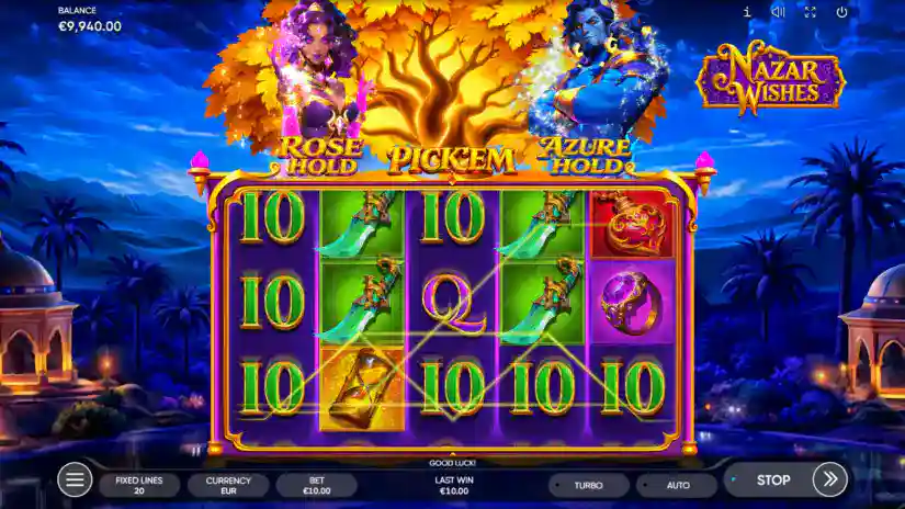NAZAR WISHES is a 5-reel, 3-row, and 20-payline slot from Endorphina. All prizes are awarded for matching combinations of symbols. Symbols must appear on paylines and on adjacent reels, starting with the leftmost one. Only the highest win is paid for combinations on each line. Wins from combinations on different lines are added together.