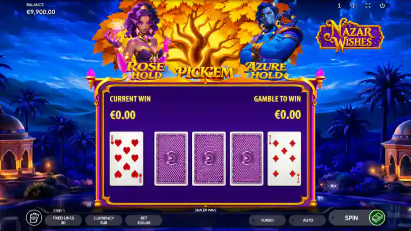 Don’t miss your chance to multiply your winnings in the Nazar Wishes slot! Choose one of four face-down cards. If you beat the dealer’s card, your winnings are doubled, and you can bet it again (maximum 10 attempts). If the dealer wins, you lose all your winnings, and the Risk Game ends.