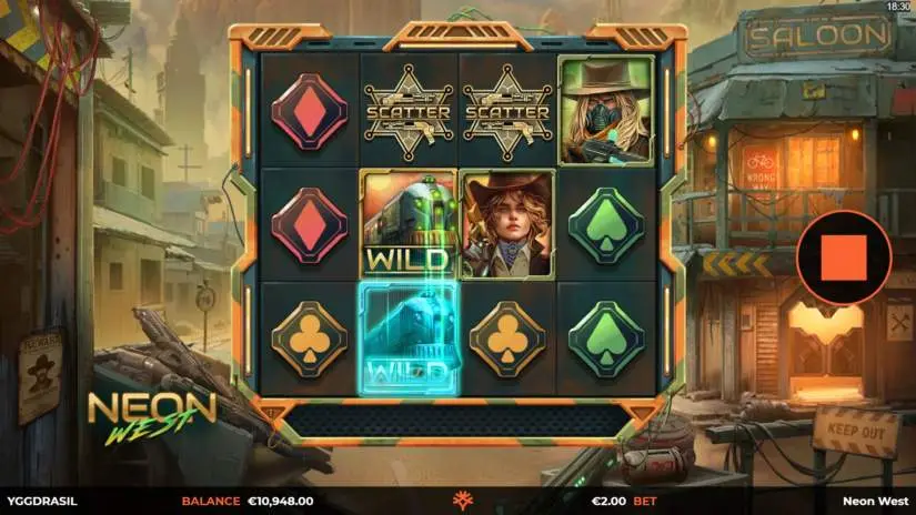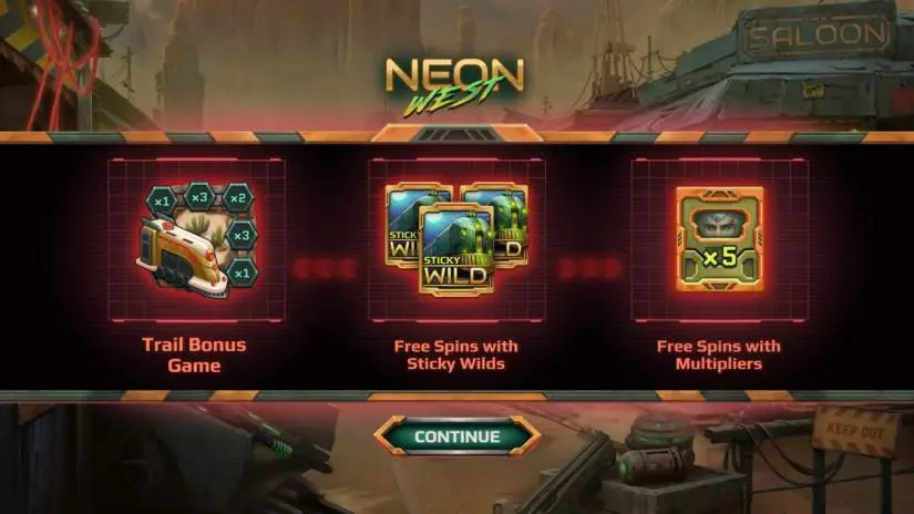 Welcome to the Neon West slot from Yggdrasil Gaming, featuring expanding wild symbols, free spins with sticky wilds, free spins with multipliers, and a trail bonus game!