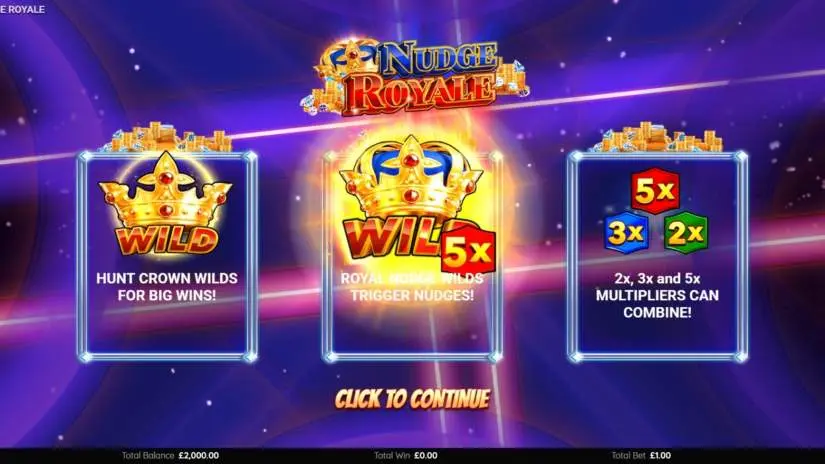 On any spin, a ROYAL WILD Nudges symbol may appear on the third reel. If this happens, the player will be awarded a prize multiplied by 3x the total bet and 10 NIPPLES. The third reel will freeze, while the first and second reels will NIPPLE. Wins will be awarded, and NIPPLES will continue until all 10 symbols have landed.