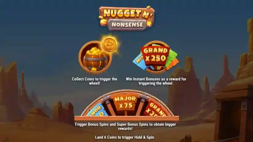 Coins can appear on all reels. Landing coins can trigger a special feature: Mini Bonus (10x), Minor Bonus (20x), Major Bonus (75x), Main Bonus (250x), Spin Bonus, or Super Spin Bonus. The wheel representation does not reflect actual probabilities. All prizes expressed as “x” are awarded as multiples of the total bet. Landing 6 coins triggers the Hold & Spin feature.
