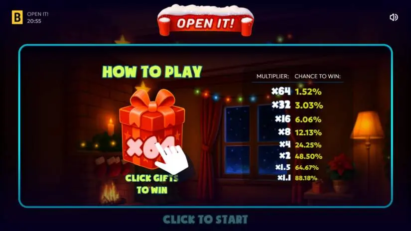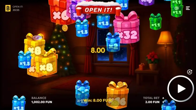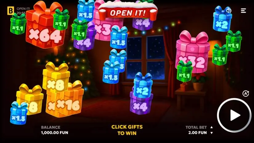 What could be more exciting during the holidays than opening presents? Open It! from BGaming offers an endless supply! Each gift has a multiplier—the biggest one is x64 of your bet! Choose your favorite gift and try to open it. Will it open right away, or will you need a little luck to get it right? Give it a try and watch your winnings multiply along with the holiday joy!