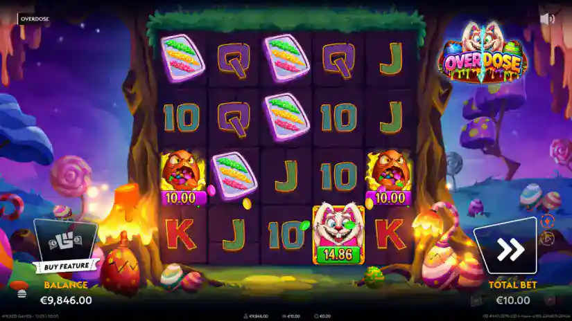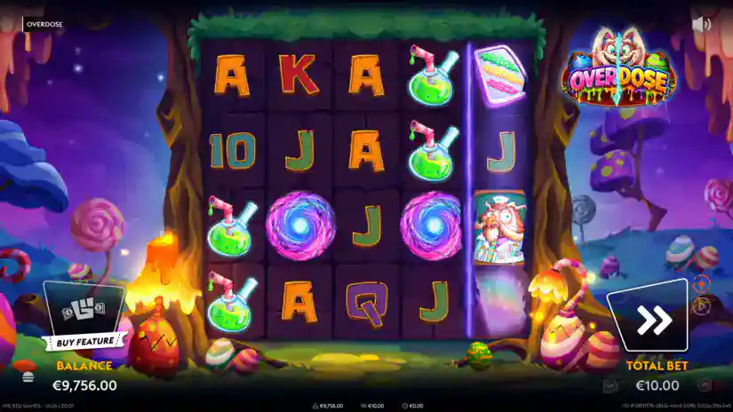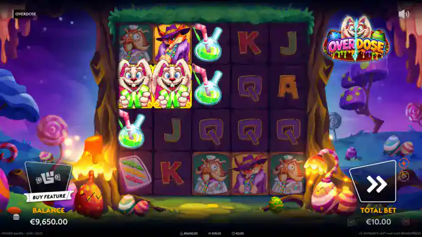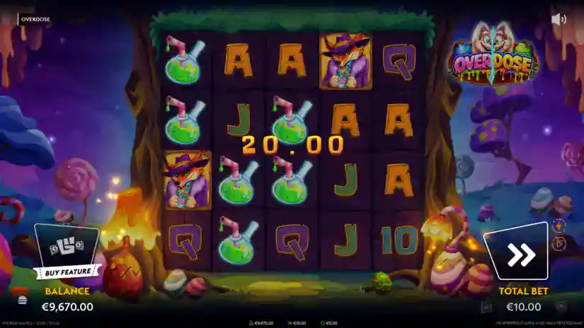 The maximum win in Overdose is capped at 50,000x your bet. Reaching this limit immediately ends the feature, and your winnings will be credited. If the limit is reached during free spins and/or other bonus features, the feature ends, and any remaining free spins and/or bonus features will be forfeited.