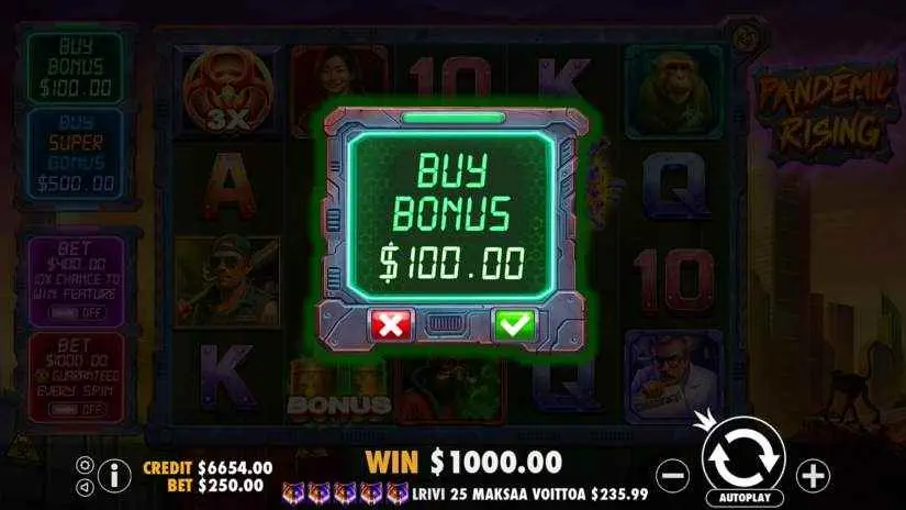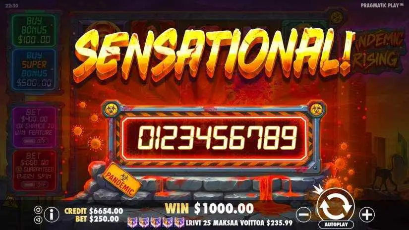 The maximum win in Pandemic Rising is capped at 14,000x the bet. If the total win during the FREE SPINS round reaches 14,000x the bet, the round ends immediately, the winnings are awarded, and all remaining free spins are cancelled.