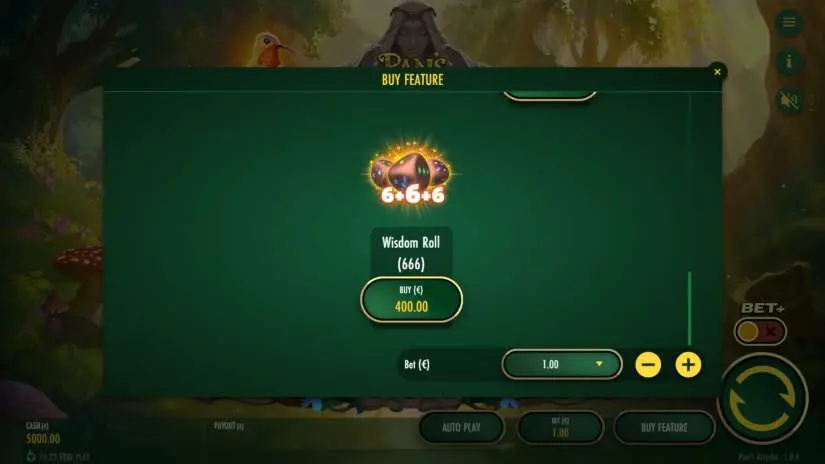 A feature buy option may be purchased at a cost that is a multiple of the current bet size. A purchase starts a spin with an outcome that triggers the Bonus Game. Options include: Hope Roll (XXX) (RTP 94.79%) Fire Roll (111) (RTP 95.62%) Water Roll (222) (RTP 95.26%) Earth Roll (333) (RTP 95.15%) Wind Roll (444) (RTP 94.85%) Chaos Roll (555) (RTP 94.59%) Wisdom Roll (666) (RTP 94.41%) All outcomes from a feature purchase pays according to the paytable and in relation to the bet size. The feature buy functionality may not be available in all markets.