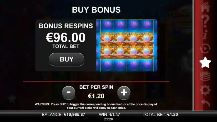 The player can purchase a Bonus Re-Spins round. The purchase price is 3200x the base bet. The game is played with 40x the base bet. A spin occurs, which always results in 6 or more “PEARL” symbols.