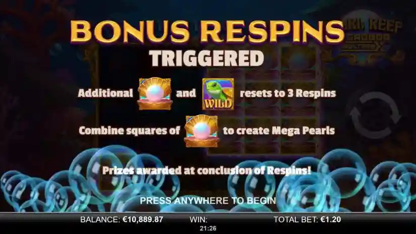 Bonus Re-Spins are activated when 6 or more PEARL symbols appear. Three re-spins are awarded. During bonus re-spins, each PEARL awards a random prize. If PEARLS completely fill a 2×2 square or more, they are grouped into a MEGA PEARL.