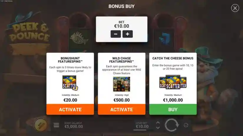 The maximum win in Peek & Pounce is 10,000 times the current bet level. The maximum win can be achieved by activating certain combinations and/or features.