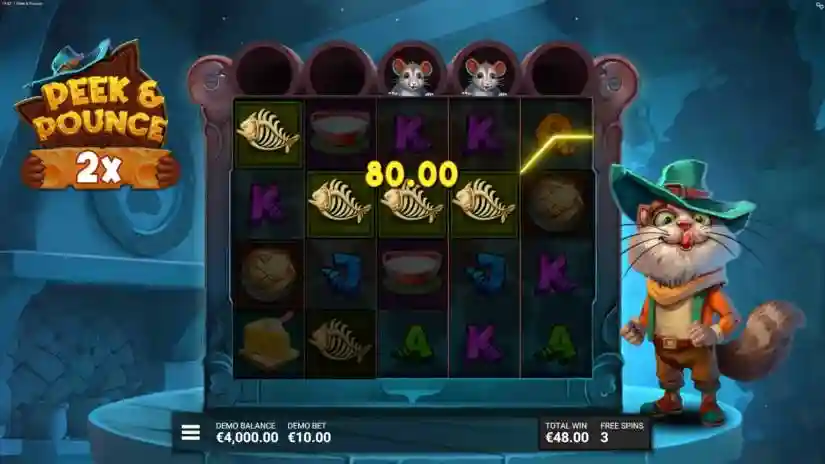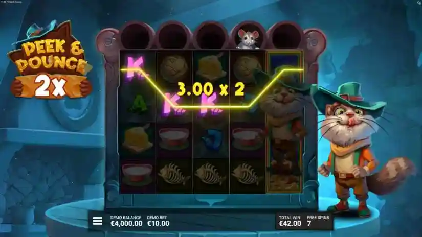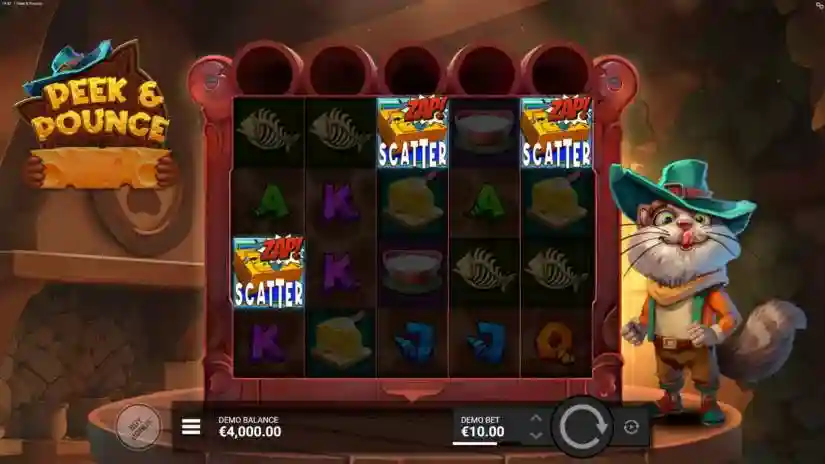 Peek & Pounce is a 5-reel, 4-row slot from NowNow Gaming and Hacksaw Gaming, featuring the cunning Señor Pounce hunting the brave Pip and his gang of mischievous mice. Above the reels, Pip’s friends peek out from their hiding places, daring the wily cat to make a move. When Señor Pounce symbols land under a peeking mouse, the Wild Chase is activated: the cat leaps upward, snatches the prey, and transforms the reel into Wild symbols. Each catch awards a multiplier of up to 500x, and with multiple chases, the Wild reels accumulate, and the multipliers combine for explosive wins. The chase reaches a new level in the Catch the Cheese Bonus, where more of Pip’s gang appears, and Señor Pounce attacks more frequently, filling the reels with even more Wild symbols and awarding truly cheesy rewards.