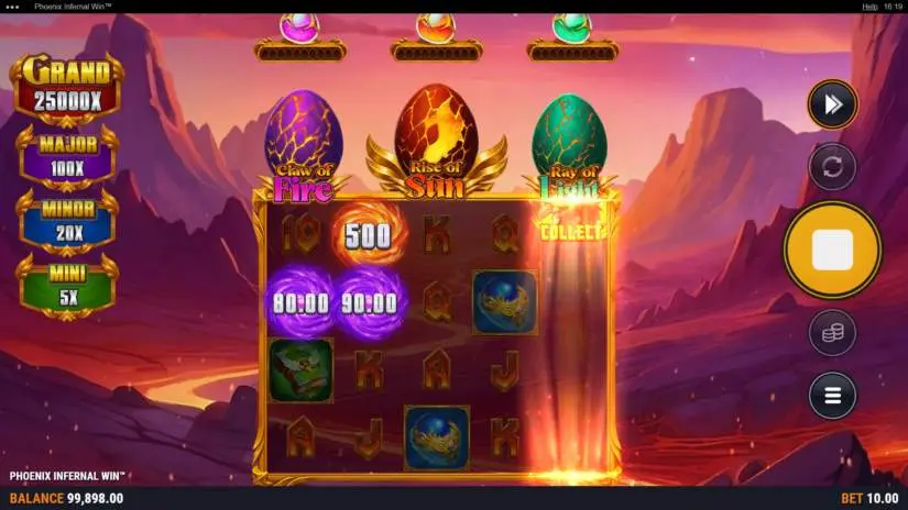 Green, purple, and red Wisp symbols are collected into a corresponding phoenix egg. Each time a corresponding Wisp is collected, a bonus game is triggered. Three bonus games are available: Ray of Light, Claw of Fire, and Rise of Sun. Ray of Light is played with green Wisp symbols, Claw of Fire is played with purple Wisp symbols, and Rise of Sun is played with red Wisp symbols.