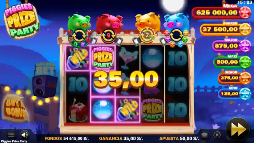 Piggies Prize Party is a 5-reel, 3-row video slot with 25 paylines. A payout is awarded when three or more matching symbols appear on a payline, starting from the leftmost reel.