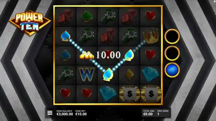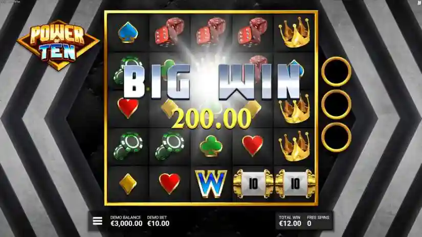 The maximum win in the Power of Ten game is 10,000 times the current bet level. The maximum win can be achieved by activating certain combinations and/or features.
