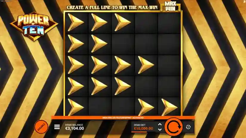 When five Arrows of Power appear in a line on a single row, the maximum win of 10,000 times your bet is awarded as a cash prize. If a row is interrupted by an empty cell, that row of Arrows of Power becomes inactive.