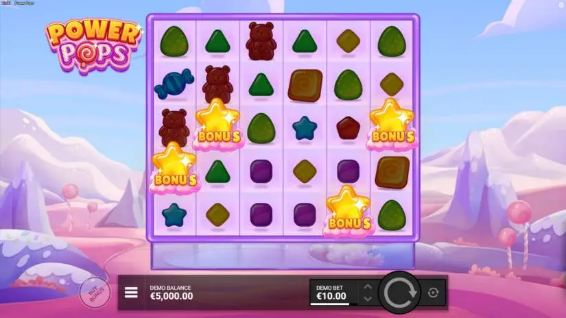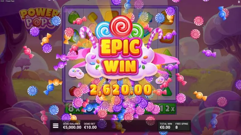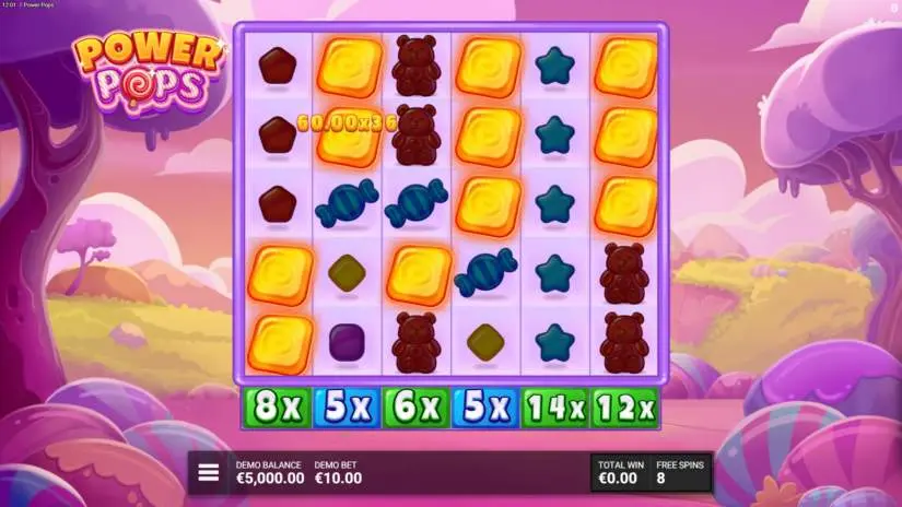 All paying symbols in Power Pops are Scatter based, meaning at least 8 identical symbols must land anywhere on the grid to win.