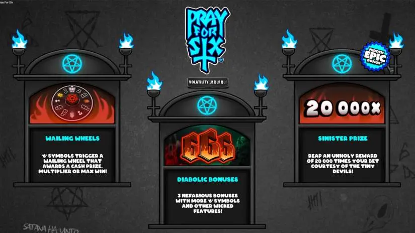 You’d think the worst thing to come out of Hell would be the Devil himself. But it seems someone left the gates of hell’s kindergarten open… Meet the Devil’s Spawn and his Doghead in Pray for Six from Hacksaw Gaming—two mischief-makers who leave a trail of tears in their wake as they rampage through the infernal realm. Together, they frolic in the Devil’s playground, setting souls ablaze and tormenting martyrs. Pray for Six is a cascading game with 6 reels and 5 rows, where wins are counted by Scatter symbols, and the maximum win reaches 20,000 times the bet, available in all game modes. It looks like it’s time for the games in Purgatory—and Balthazar and Beelzebub have rivals.