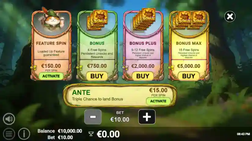 Get access to the bonus mode with 6 free spins for 75x your bet. You can also purchase access to multiple levels of bonus modes for specified amounts, starting with the specified number of free spins.