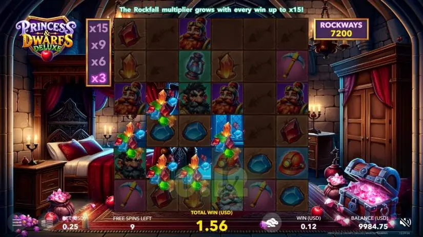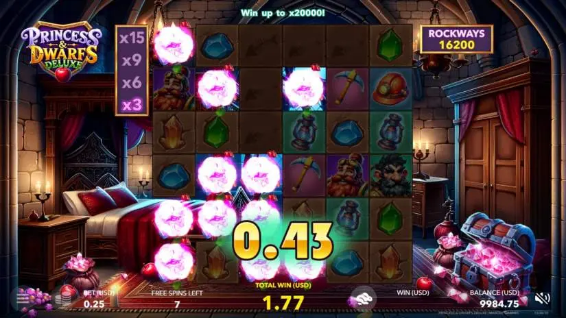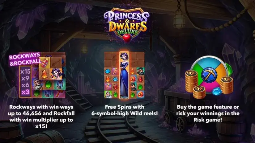 Princess and Dwarfs Deluxe by Mascot Gaming is a 6-reel slot machine with a Rockways payout system. The game starts with a base game, where each spin subtracts the player’s chosen bet amount. In the base game, players can activate free spins or a risk game.