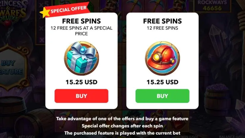 The Risk & Buy feature in Princess and Dwarfs Deluxe offers the player the option to buy a feature or risk their winnings to try to increase them. The Buy offer allows the player to purchase a feature at the offered conditions and price at any time during the main game. A random Special Buy offer will also appear after each spin. The Risk offer will allow the player to try to increase their winnings in the Risk game by earning a win multiplier. The maximum multiplier in the Risk game is x1000 of the total bet. If the player accepts the Buy offer, the cost of the feature will be deducted from their balance as a bet and the feature will start immediately. If the player decides to risk their winnings in the Risk game, the winnings will be credited to the balance at the end of the Risk game, and in the event of a loss, they will be deducted from the balance as a bet. The feature obtained through the Risk & Buy feature will be played with the same bet with which the player obtained it. The Risk’n’Buy feature is not available in autoplay mode.