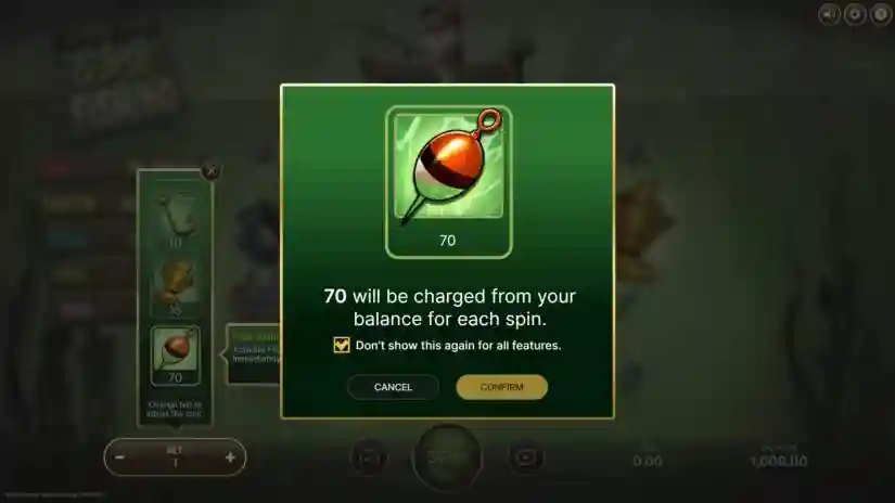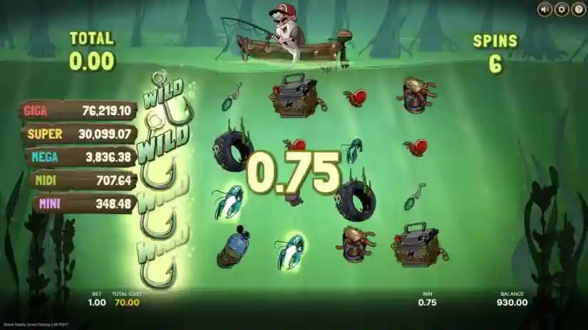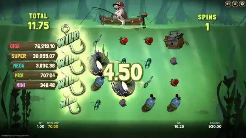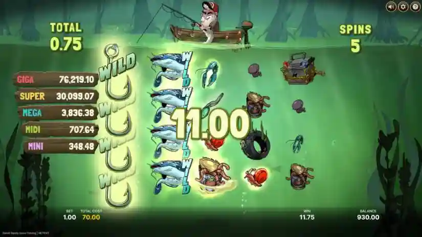In the main game and during free spins, the Jackpot symbol can only appear on reel 5. When it appears on a row with the Hook Wild symbol, the Jackpot game is activated, which is started by clicking or tapping the “Click to Catch!” button on the screen.