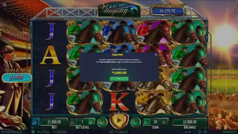 The SUPER BET button on the screen displays the value of each bet (*1000) when the SUPER BET feature is enabled. Click the SUPER BET button to turn the SUPER BET feature on or off. The SUPER BET pop-up window displays the ante bet conditions. Your chances of triggering the Free Games feature are increased. During Free Games, the HOLD AND RIDE feature is triggered more frequently.