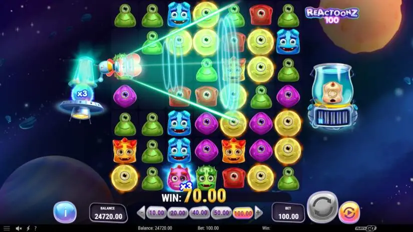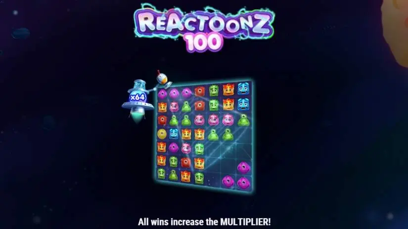 A winning combination in the Reactoonz 100 game is 5 or more symbols touching horizontally and/or vertically. Winning symbols are removed from the screen. New symbols appear, filling the empty cells.