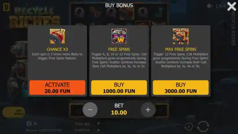 The player can purchase one of two free spins at the specified price. If the player changes the bet, the price also automatically changes. Subsequent spins after the purchase trigger free spins. This feature is disabled if the “3x Chance” feature is active.