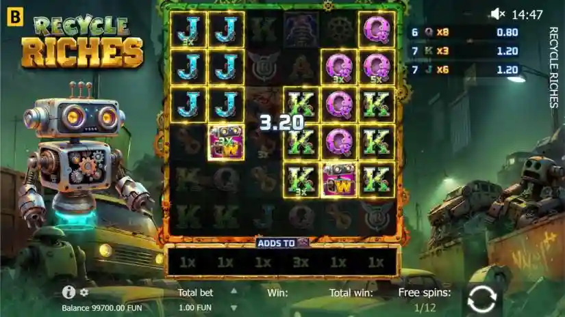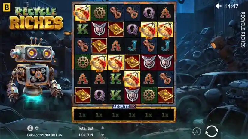 Turn trash into prizes in Recycle Riches from BGaming! Welcome to a junkyard full of broken cars and hidden rewards! In Recycle Riches, a 6×6 cluster game, you match 5 or more matching symbols to win, and the more matches you make, the bigger your wins! With each win, cells on the game board gain multipliers that grow. Wild symbols accumulate even more power from special reel multipliers, combining them for bigger rewards! Watch out for special Tesla Coil symbols—they boost reel multipliers with powerful bonuses! Trigger free spins, and cell multipliers won’t reset between spins, helping you accumulate more value with every hit. The more Scatter symbols you land, the more free spins you’ll start with—and the higher your starting multiplier! With the chance to win up to 10,000x your bet, it’s time to turn trash into treasure in Recycle Riches!