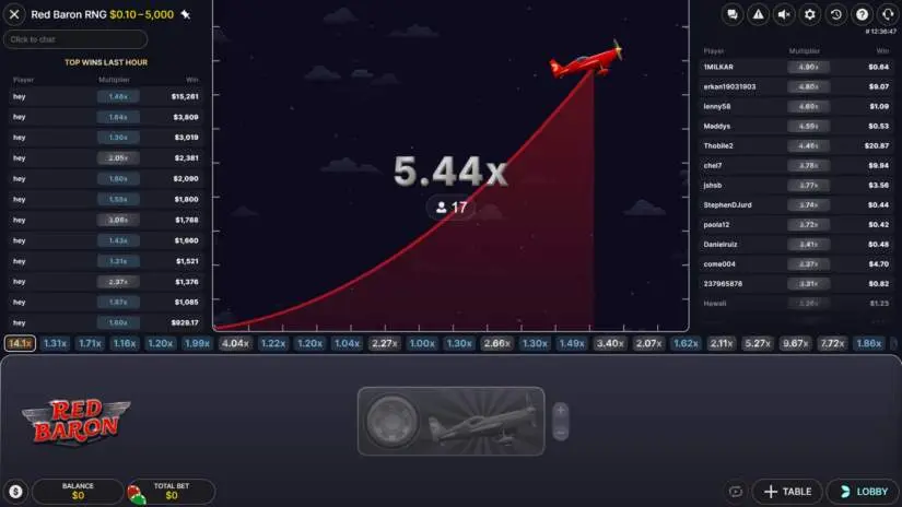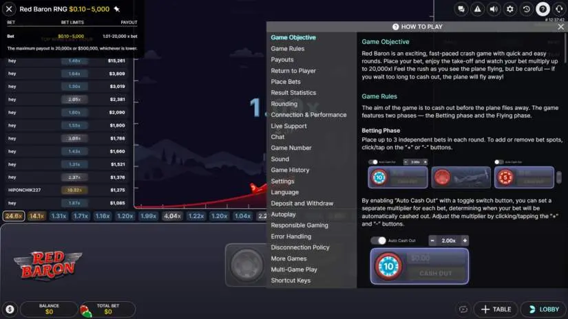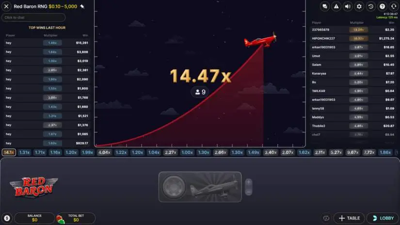 Red Baron from Evolution Gaming is an exciting, action-packed crash game with quick and easy rounds. Place your bet, enjoy the takeoff, and watch your bet multiplied up to 20,000x! Feel the thrill of watching the plane fly, but be careful—if you wait too long to collect your payout, the plane will fly away!
