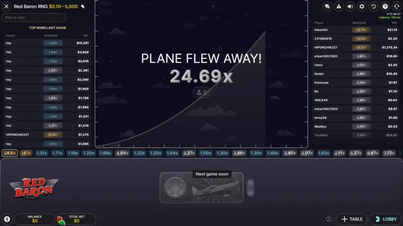 During the flight phase, you can view a list of players who have won money (available only on desktop). The list is chronological: the most recent results are displayed at the top, while older results are moved down.