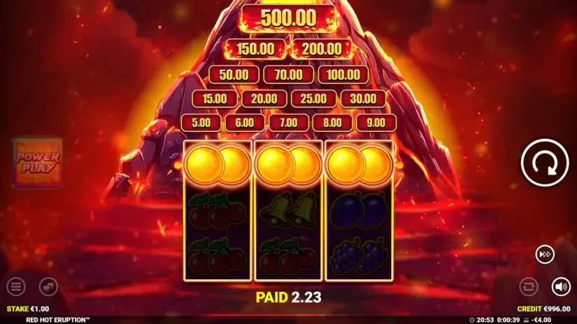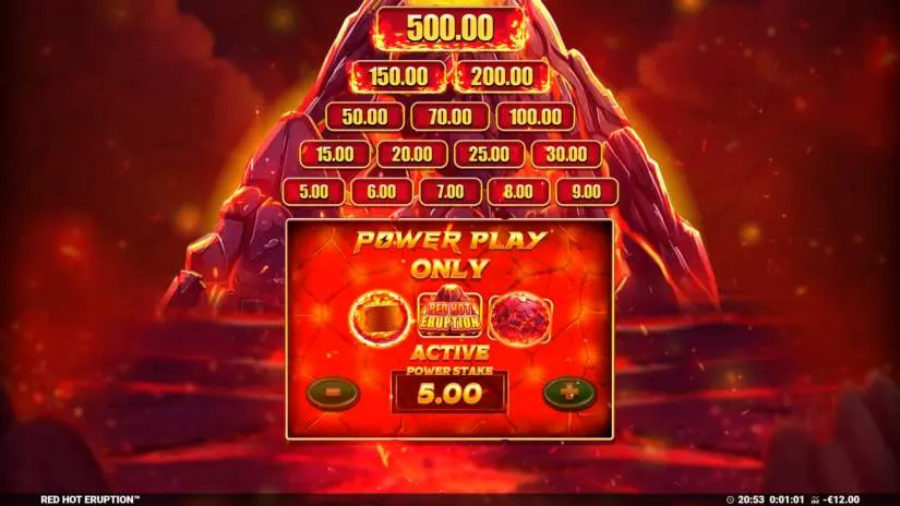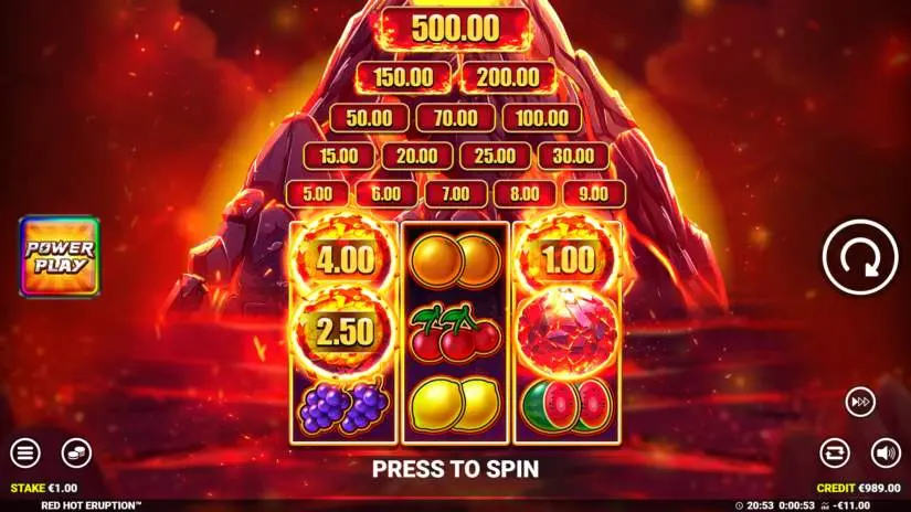 Activate Red Hot Eruption’s Power Play mode by pressing the Power Play button. In Power Play mode, your bet is multiplied by 5 times the base bet. During Power Play, the Power Reels are active. Only the Cash Prize and Cash Collection symbols are active on the reels. You can change your bet at any time by pressing the Bet button. You can return to the main reels by pressing the Standard Play button. During Power Play, features are played at the base bet.