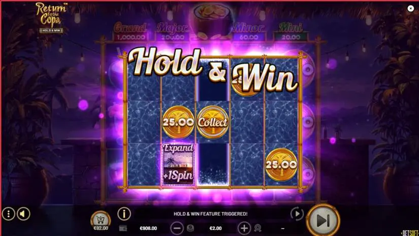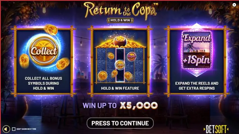 RETURN TO THE COPA – HOLD & WIN is a 5-reel, 3-row, 20-fixed-payline video slot from Betsoft. The highest win per line is paid. Matching wins on different paylines are added together. Payouts are dynamically adjusted based on the selected bet. BONUS symbols do not pay out during the main game. BONUS symbols appear only on reels 1, 2, 4, and 5. COLLECT symbols appear only on reel 3. The WILD symbol does not appear in the HOLD & WIN feature. Paying symbols do not appear during the HOLD & WIN feature. The HOLD & WIN feature is played with a bet equal to the bet of the triggering spin. COLLECT symbols do not have their own payout value and only collect the values of new BONUS symbols that appear on the screen. If more than one COLLECT symbol lands, each collected BONUS symbol is added to each COLLECT symbol. The +1 SPIN and EXPAND symbols can appear on all reels only during the HOLD & WIN feature and are removed from the reels afterward. The EXPAND symbol expands the reel by 1 position. The reel can be expanded up to 5 positions. If the reel has already reached its maximum size, the EXPAND symbol does not appear on the reel.