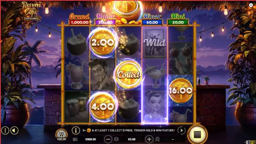 5 or more BONUS scatter symbols and at least 1 COLLECT symbol activate the HOLD & WIN feature with 9 RE-SPINS! BONUS symbols can award any win.