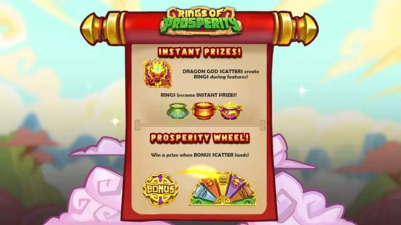 Start with 3 RINGS created by the 3 initially placed DRAGON GOD SCATTERS. DRAGON GOD SCATTERS creates RINGS of the same color as the activated POT.