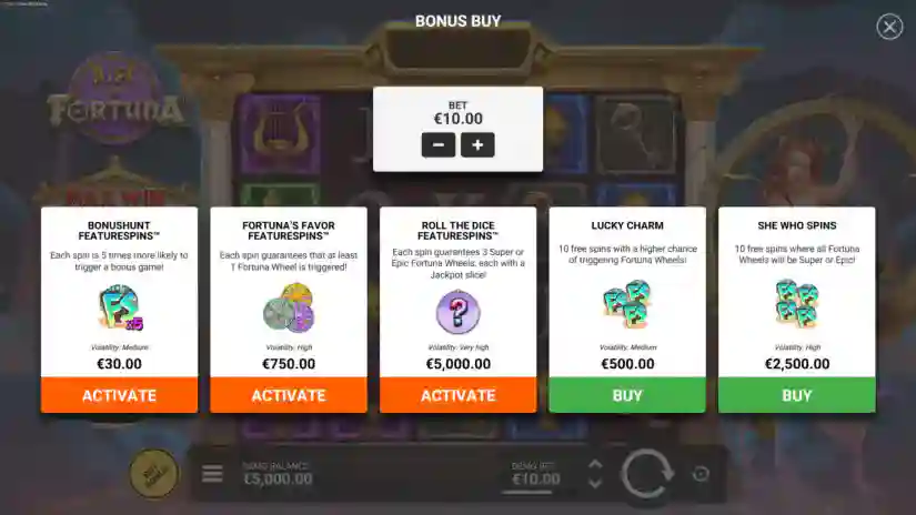 The RTP for purchasing FORTUNA’S FAVOR FEATURESPINS™ is 96.27%. For full details on this feature, please see the section above. FS symbols cannot appear in this game mode. Every spin guarantees at least one Fortuna Wheel! Volatility: High.