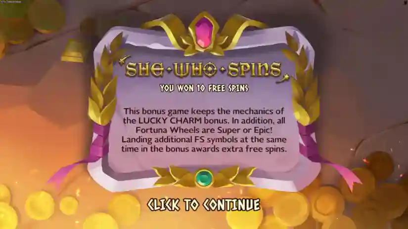 This bonus retains the SHE WHO SPINS bonus mechanics. Additionally, 3 Fortune Wheels are guaranteed to trigger on every spin!