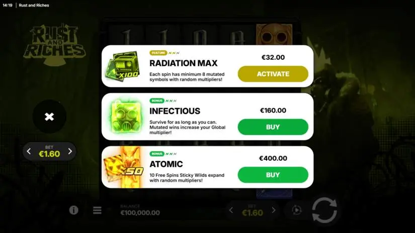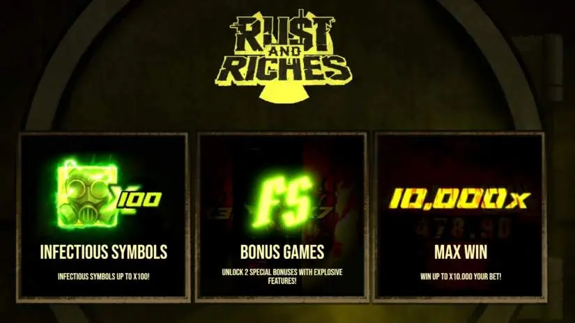 Each round is unique thanks to a variety of game modes, including explosive spins and high-stakes features. Immerse yourself in the chaos of the wasteland in Rust and Riches, embrace the volatility, and try to capture the maximum win of x10,000 of the bet. Are you ready to rise from the ruins and reclaim your fortune?
